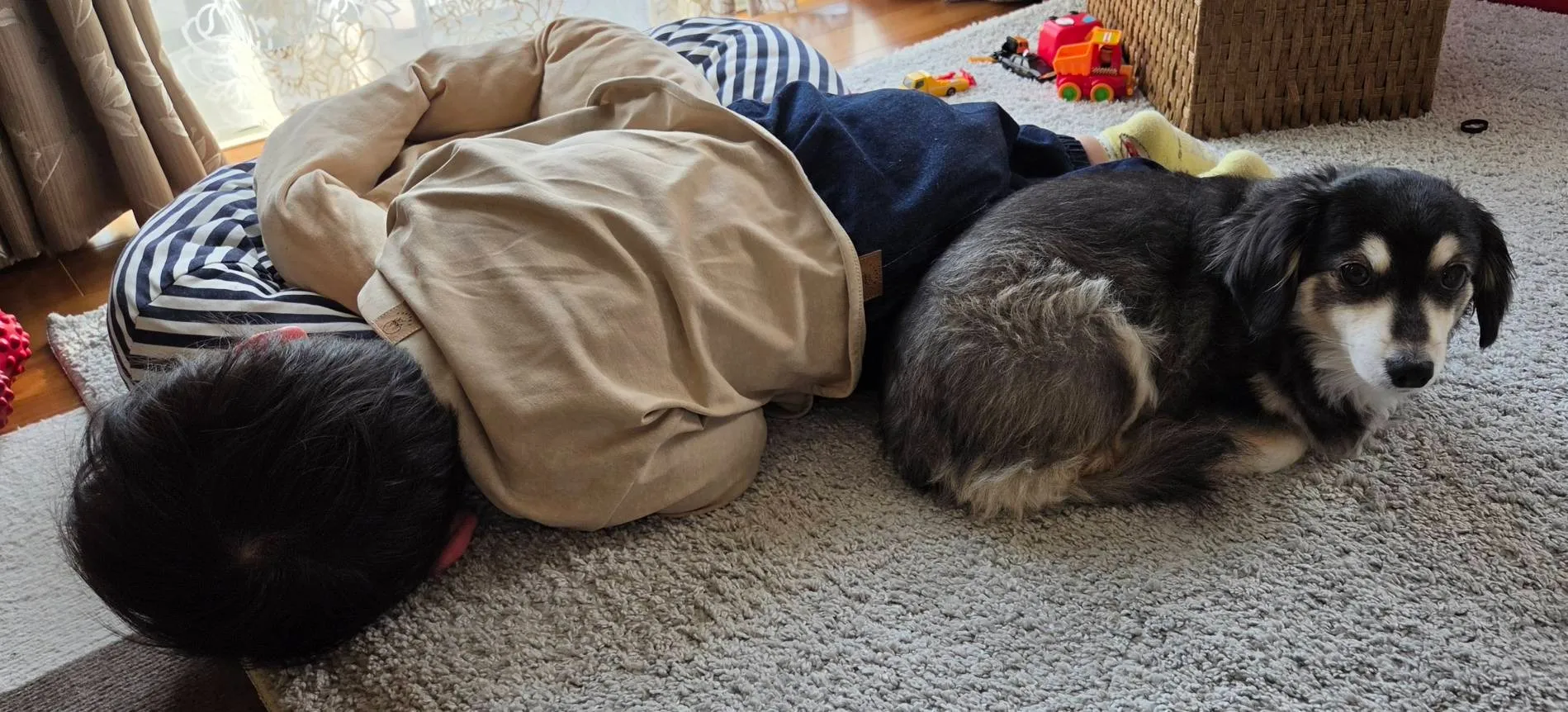愛犬は息子を怖がってなかなか近づかないのですが、お昼寝中そっと寄り添ってました。癒やされますね。